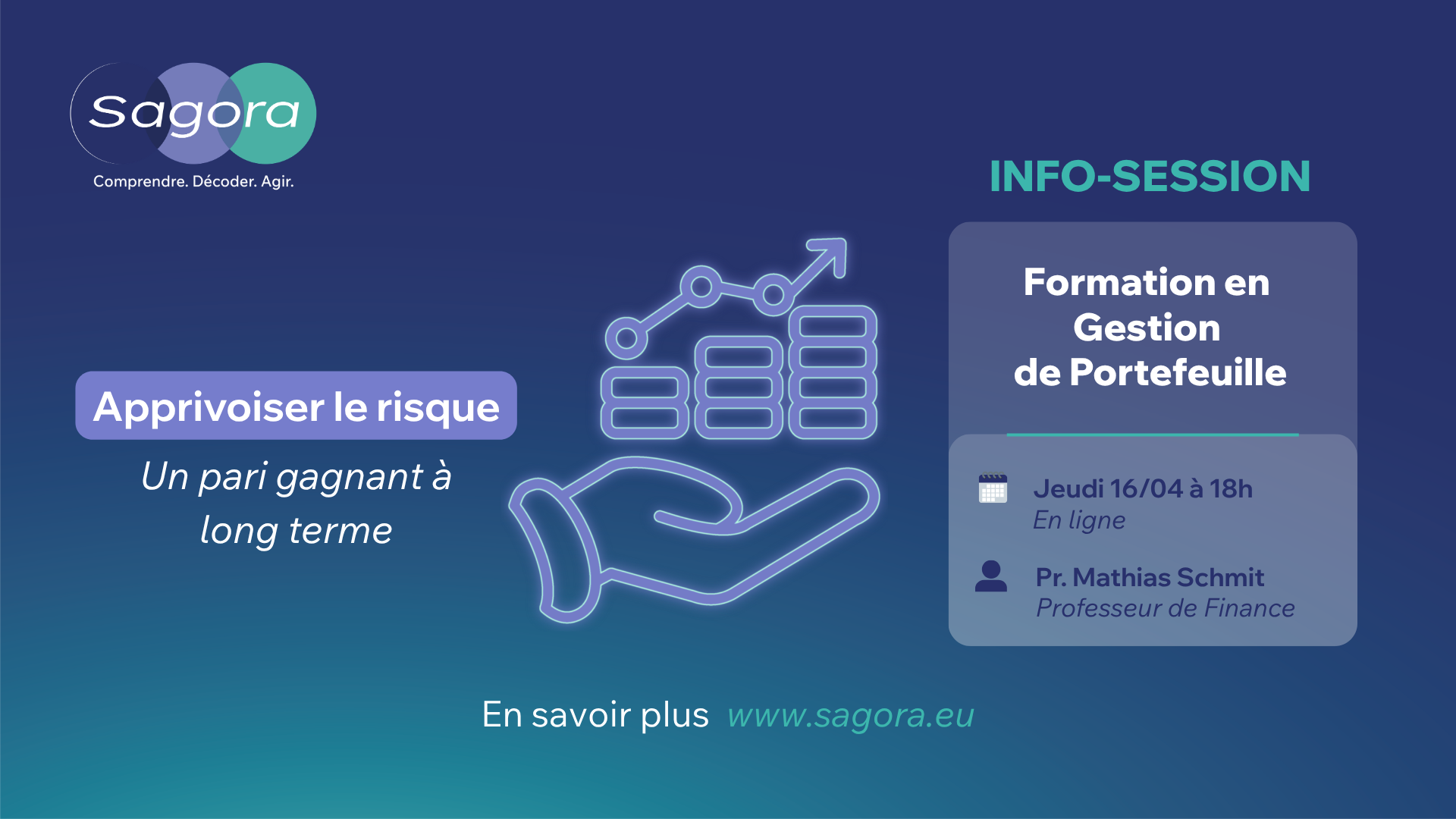 Rejoignez Mathias Schmit (professeur de finance a la Solvay Brussels School) pour une nouvelle session interactive presentant les grands axes de la formation "Gestion de portefeuille" : Comment definir ses objectifs financiers et evaluer sa tolerance au risque, Les principes de diversification et d'allocation d'actifs, Les approches actives et passives et leurs implications concretes, Les erreurs frequentes des investisseurs et comment les eviter. L'info session sera aussi l'occasion de repondre a vos questions et de vous donner un apercu de la methode pedagogique Sagora : une approche rigoureuse et accessible.